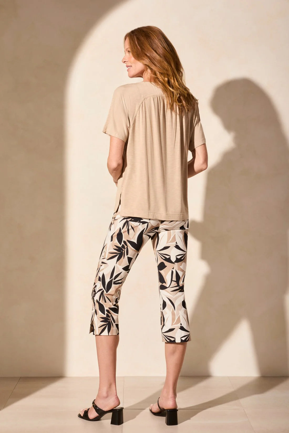 TRIBAL BACK SHIRRED CREW NECK TOP - PEBBLE