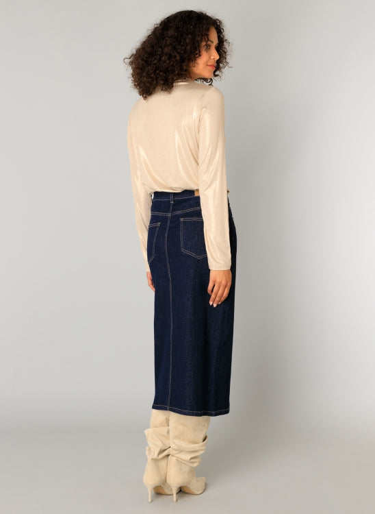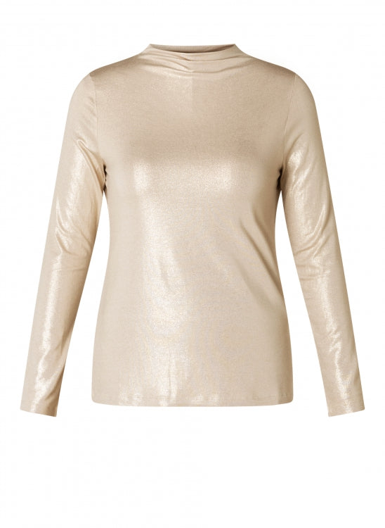 This long-sleeved top is made from a soft viscose blend with elastane, giving it a comfortable fit. The slim fit emphasises the silhouette, while the stand-up collar adds a modern detail. The sand colour with a subtle sheen gives the top a festive accent, perfect for wearing on its own or under a blazer.